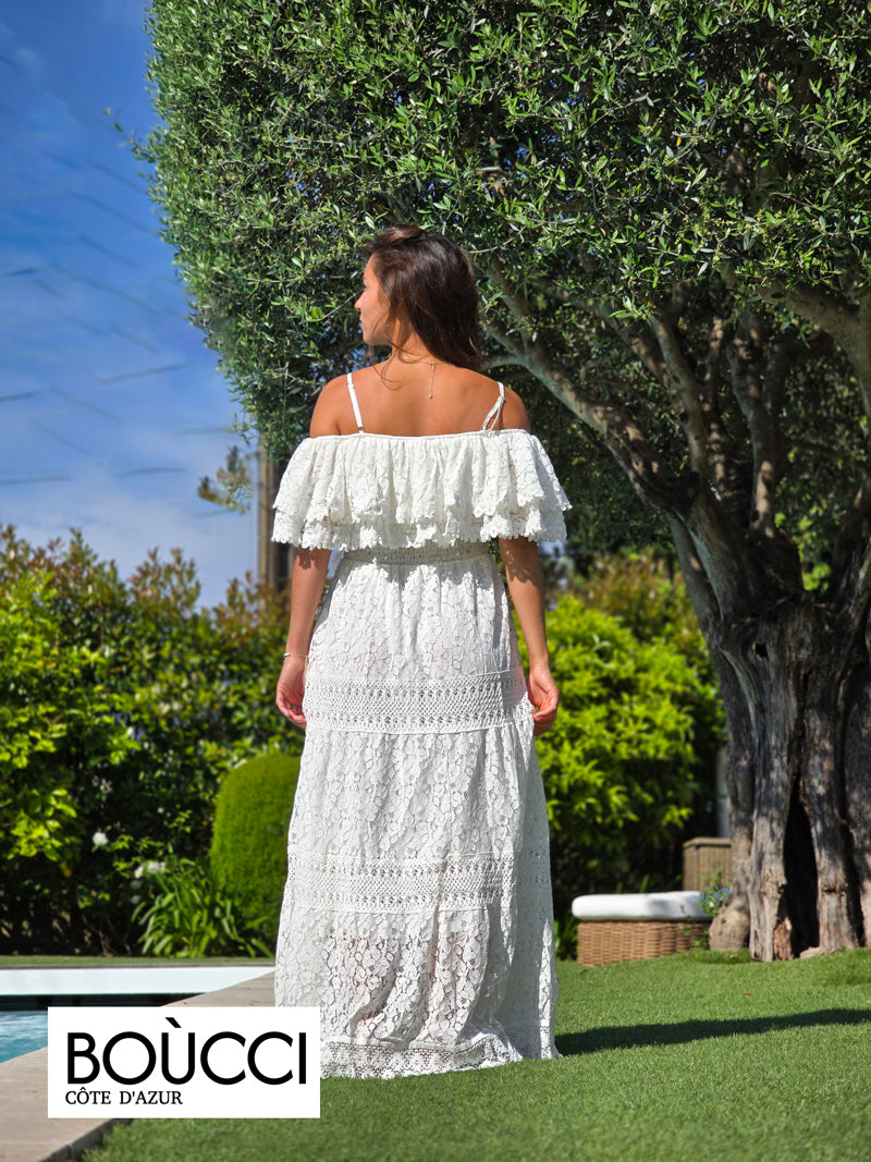 Esprit Dentelle – Robe Longue Épaules Dénudées en Broderie Blanche